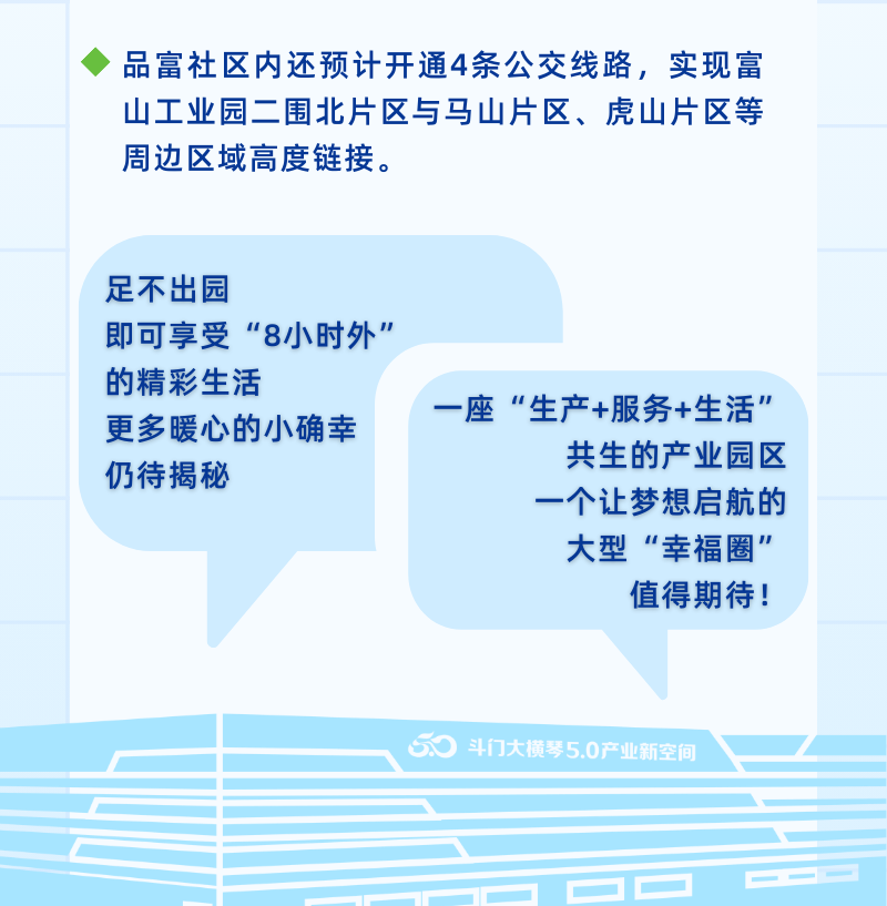 新空間,托起產(chǎn)業(yè)新夢想。作為一座能“拎機(jī)投產(chǎn)”“拎包入住”的高質(zhì)量園區(qū),斗門大橫琴5.0產(chǎn)業(yè)新空間不僅適應(yīng)新形勢、賦能新技術(shù)、承載新產(chǎn)業(yè),還配備能滿足員工吃、住、娛樂休閑等需求的生活、商業(yè)配套。