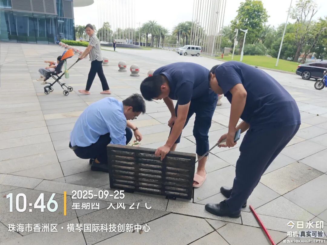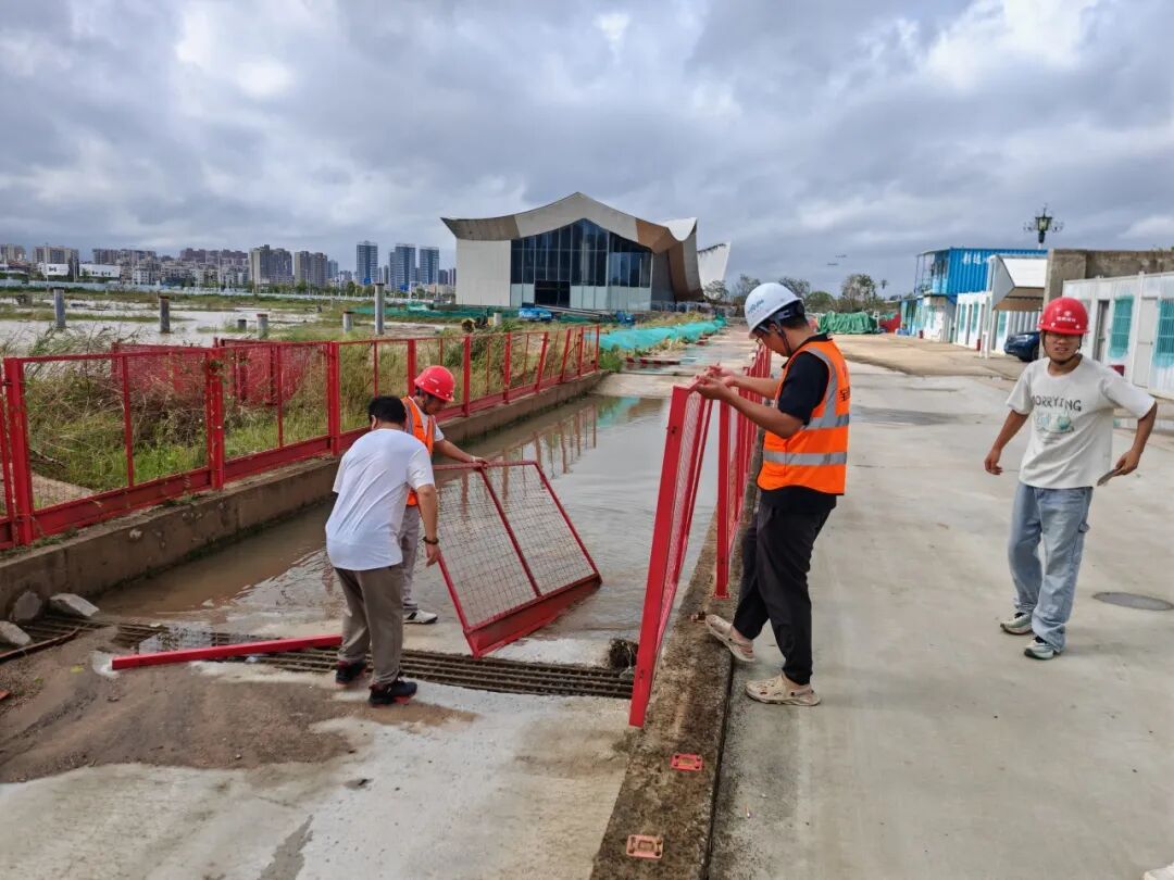 臺(tái)風(fēng)期間,受風(fēng)暴潮影響,橫琴天沐河水位上漲,珠光集團(tuán)迅速組織搶險(xiǎn)力量,通過(guò)加筑沙袋有效阻止海水倒灌進(jìn)天沐河,同步安全轉(zhuǎn)移設(shè)備設(shè)施,并緊急安裝抽水設(shè)備清理積水,避免變電房被水浸泡。臺(tái)風(fēng)過(guò)境后,搶險(xiǎn)隊(duì)伍立即投入后續(xù)清理工作,第一時(shí)間清理泵站進(jìn)水口垃圾,保障泵站排水通暢,降低村渠水位;清理排水口垃圾,保障土渠排水暢通;并全力協(xié)助合作區(qū)市政管理署,清理倒塌的邊境圍網(wǎng)。